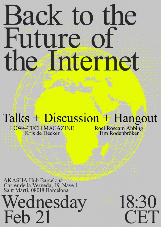 Low-Tech Magazine explores techniques of the past and combines them with the knowledge of today to propose more sustainable futures. Based on this idea, Kris de Decker and Roel Roscam Abbing organize an evening exploring concepts from the Internet’s history that can help create a more sustainable future internet.