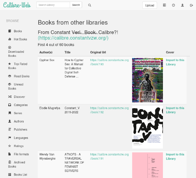 Once these are added, there is a list view that display the latest n number of books from those remote libraries. While this view looks like any other one in calibre-web that shows books, all the links (covers, descriptions etc.) take you to the remote libraries. This is thought of as a way to make links between the local and the remote, and allow for more exploration of the remote.