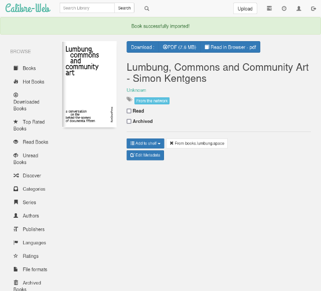 There were early ideas and designs for showing the provenance of imported works by embedding provenance in a publication’s metadata. Initially considered as a way to credit the remote library, or as a way to demonstrate how a particular collection is made up of many collections, these ideas were dropped as the downsides can be considerable. Showing that a specific publication came from a specific library is very risky in the context of shadow libraries. Especially when there are no explicit ways to reject interconnection and when metadata is embedded in the files themselves. Currently, provenance appears only in the form of particular shelves in the library named after the origin library (which can be disabled or made invisible to the public), and the tag “from the network” attached to particular publications.