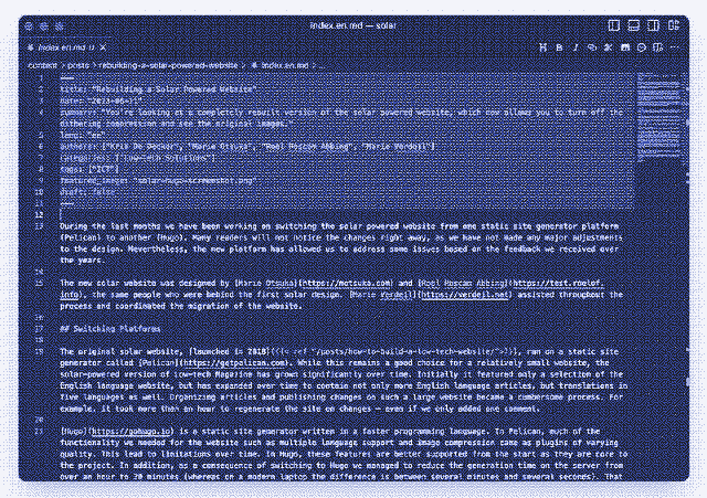 In June 2023, we released a new version of solar.lowtechmagazine.com. After five years of running it on Pelican we started to realize the limitations of that platform and rebuilt the entire website in Hugo. In the release announcement, we go into more detail as to why and what has changed with the new design.