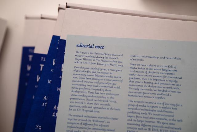 From January to April 2019 on behalf of Varia, Manetta Berends and me taught a thematic course at the Experimental Publishing Master’s programme at the Piet Zwart Institute. Responding to new developments in federated social media and the trimester sought to understand what on-line federation is and how novel forms of publishing could be imagined in that environment. Consequently the trimester was centered around practices of self-hosting, the history and practice of computer networking, feminist servers, diy chatbots as publication tools, shared on-line spaces and hybrid publishing practices.
