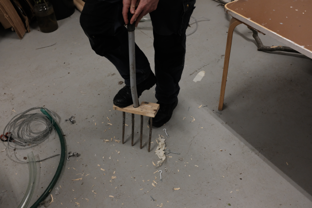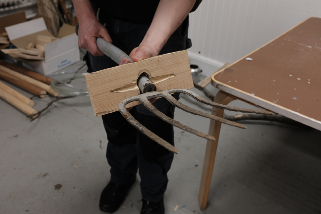 Several broken forks were brought to the workshop space and the farmer indicated the hay forks were often used for soil works because they were easier to carry and lighter to work with. One of the outcomes was a solution to create a dismountable platform to make it easier to push the heavy fork into the soil.